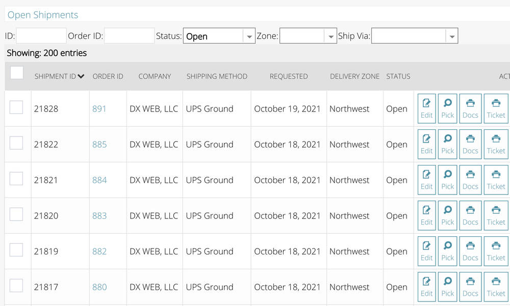 Your warehouse staff can quickly see new open shipments at a glance, bulk print shipment documents (Pick tickets and Packing Slips), and quickly get orders picked, packed and shipped!